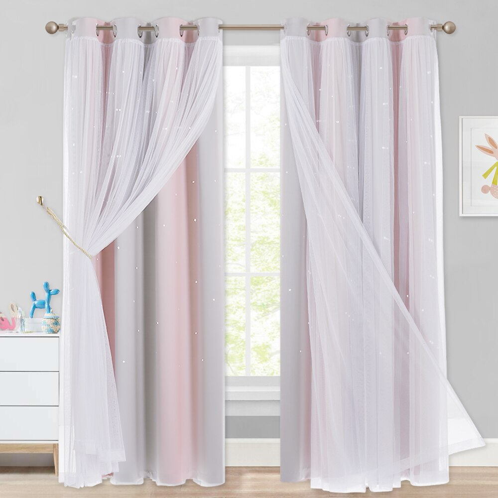 - Doppellagiges Design: Die Kombination aus blickdichtem Stoff und transparentem Tüll sorgt für optimale Lichtkontrolle und eine verträumte Optik.