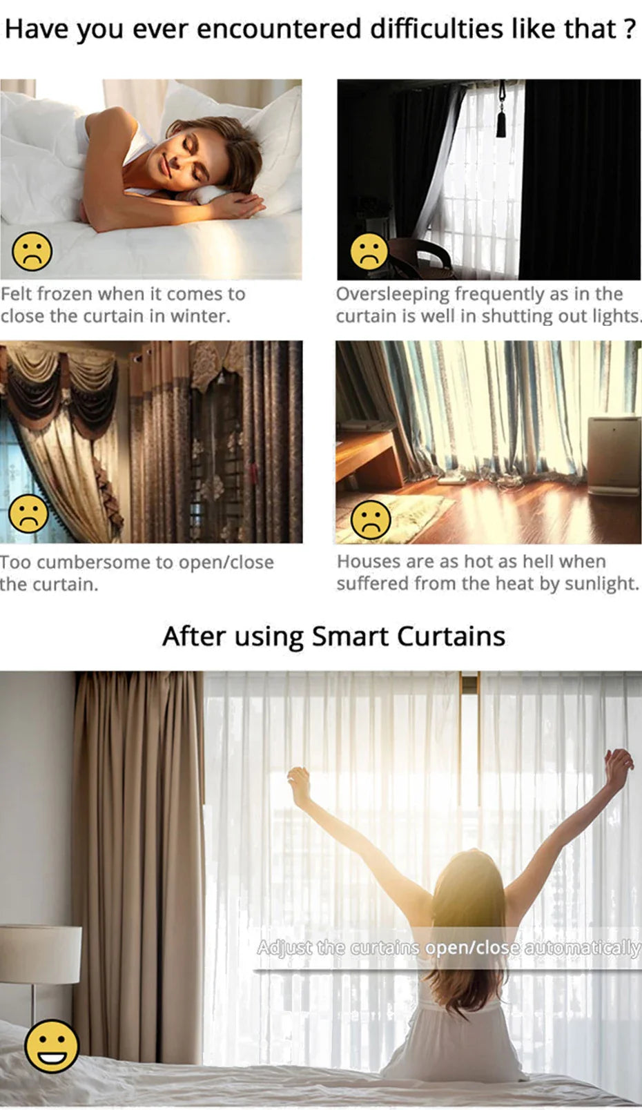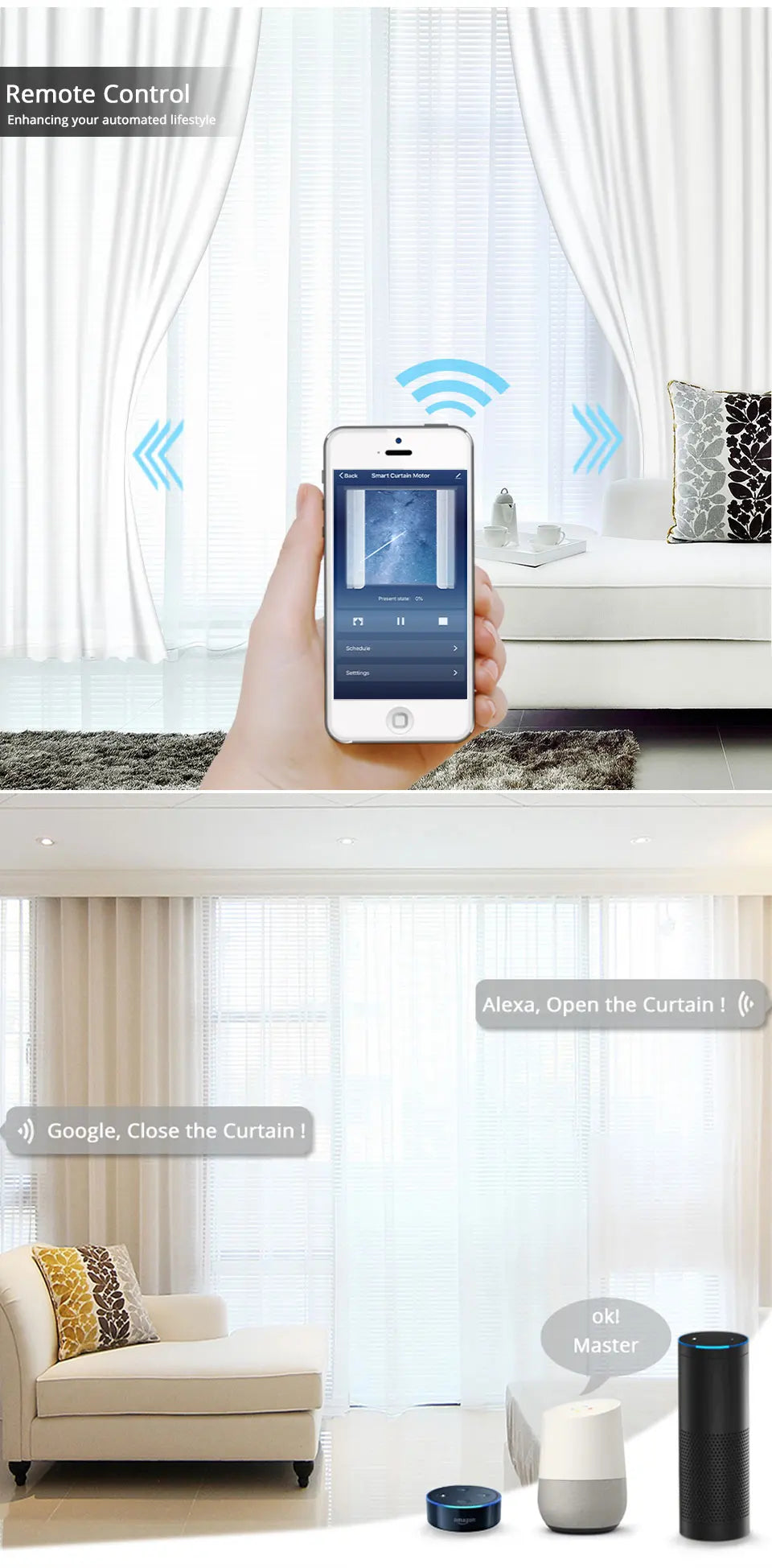- Erhöhte Privatsphäre und Sicherheit: Schließen Sie Ihre Gardinen bequem per Fernzugriff, auch wenn Sie nicht zu Hause sind.
