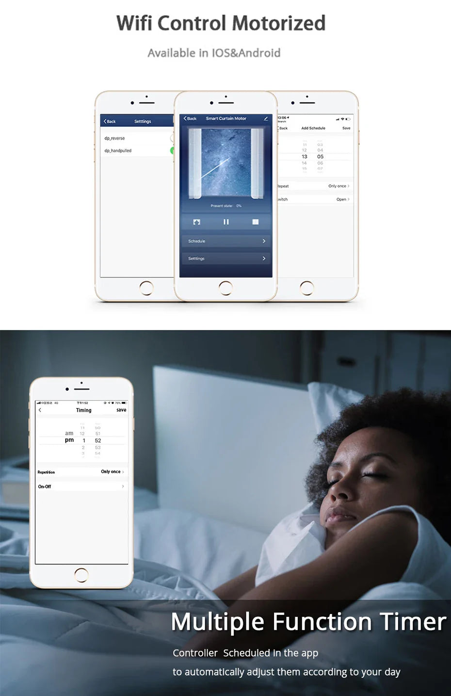 - Automatisierte Zeitpläne: Legen Sie individuelle Zeitpläne fest, damit sich Ihre Gardinen automatisch öffnen und schließen, ideal für das Aufstehen am Morgen oder als Anwesenheitssimulation.