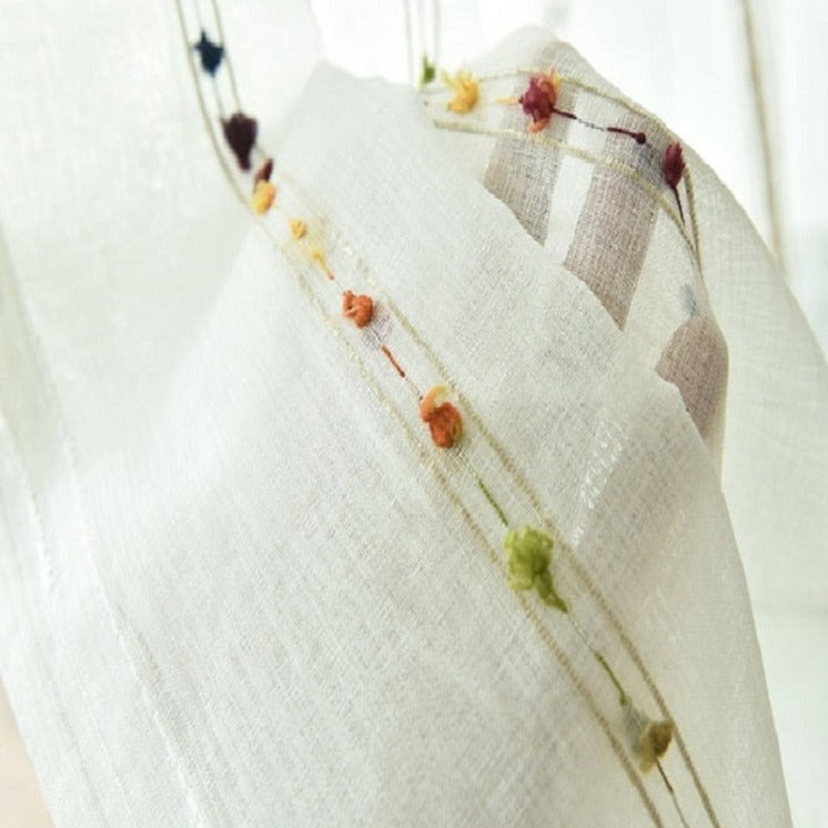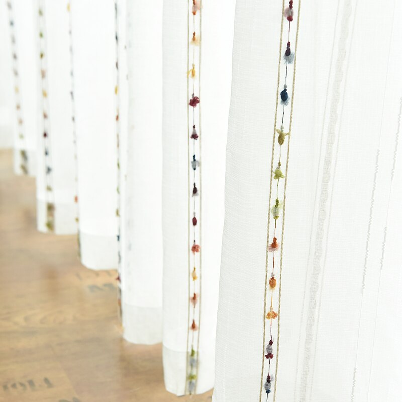 Verleihen Sie Ihrem Raum mit unserer Leinengardine mit bunten Pompons einen frischen Look