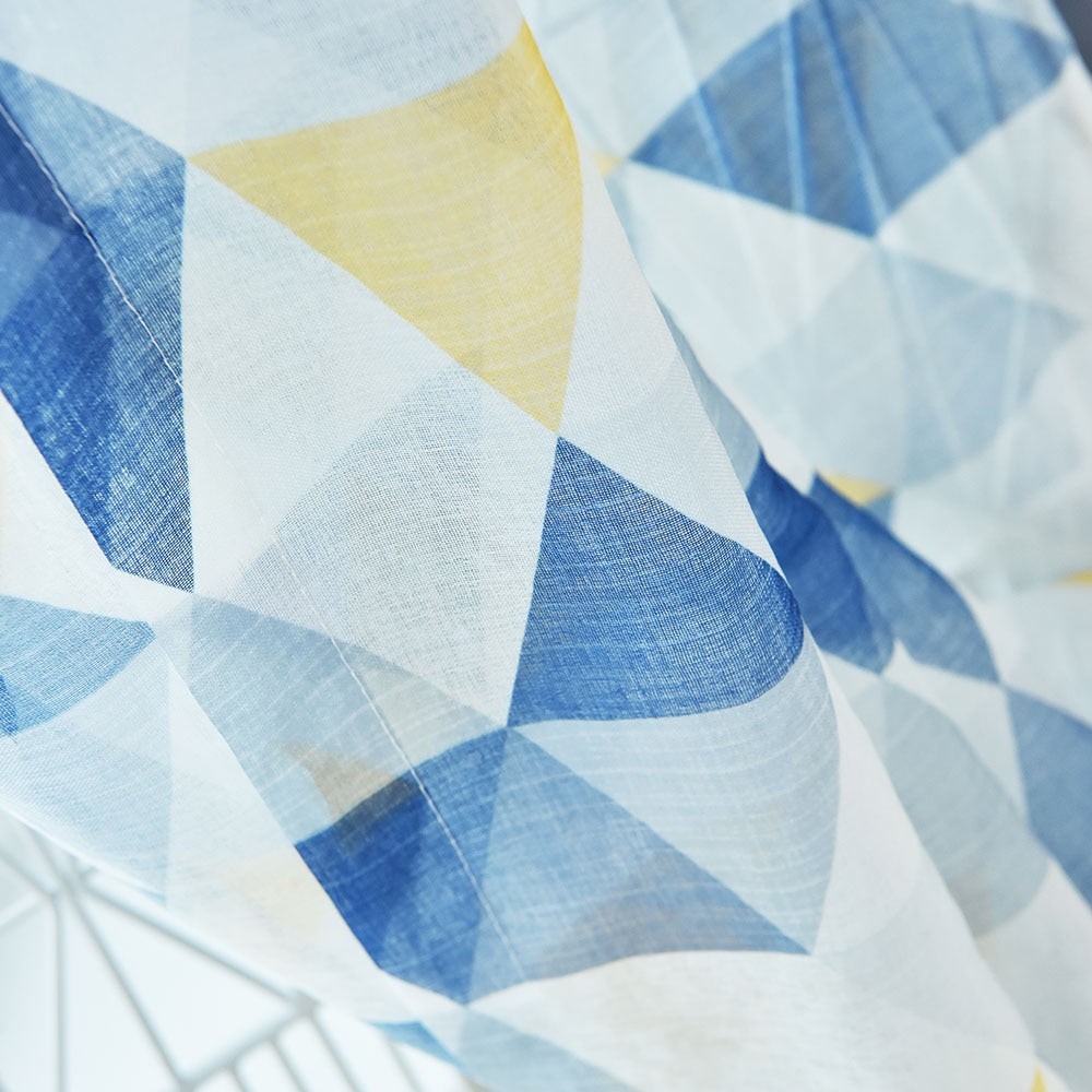 Verwandeln Sie Ihr Zuhause mit unserer atemberaubenden modernen Gardine, die mit einem lebhaften geometrischen Muster begeistert! Stellen Sie sich vor, wie diese leichte Gardine mit ihren frischen Blau-, strahlenden Gelb- und klaren Weißtönen Ihr Zimmer sofort aufhellt und eine einladende Atmosphäre schafft. Das einzigartige Dreiecksmuster verleiht Ihrem Raum eine moderne, dynamische Note und ist gleichzeitig zeitlos elegant. Sie suchen nach einer Möglichkeit, frischen Wind in Ihr Interieur zu bringen, ohne aufdringlich zu wirken? Dann ist diese Gardine genau das Richtige für Sie. Sie lässt sanftes Licht herein und bietet gleichzeitig ein angenehmes Maß an Privatsphäre – perfekt, um sich in Ihren eigenen vier Wänden rundum wohlzufühlen.