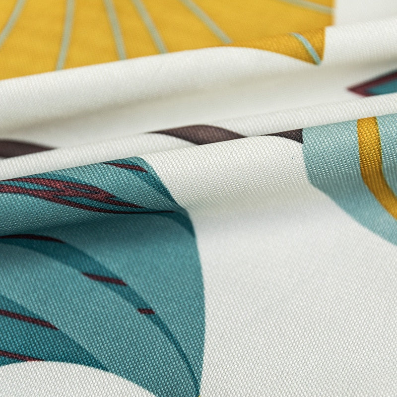 Das Herzstück dieses Vorhangs ist sein wunderschönes abstraktes Blattmuster, das durch eine harmonische Farbkombination aus frischem Türkis, warmem Senfgelb und dezentem Dunkelbraun auf einem cremeweißen Hintergrund besticht. Diese Farben sind typisch für den skandinavischen Stil und lassen sich wunderbar in viele bestehende Einrichtungsstile integrieren. Die organischen Formen der Blätter wirken beruhigend und modern zugleich, ohne aufdringlich zu sein. Sie erzählen eine Geschichte von Naturverbundenheit und schlichter Ästhetik, die Ihrem Raum eine zeitlose und doch trendige Note verleiht. Egal, ob Sie einen minimalistischen Look lieben oder Ihrem Raum einen Farbakzent geben möchten, dieser Vorhang ist die perfekte Wahl.