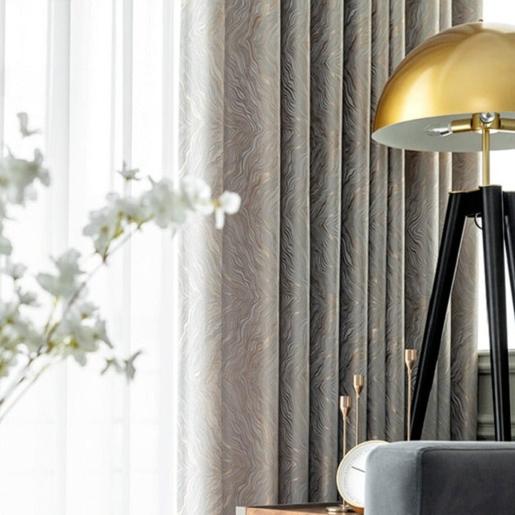 Tauchen Sie Ihre Räume in eine Atmosphäre von Eleganz und Ruhe mit unserem exquisiten Verdunkelungsvorhang. Dieser Vorhang ist nicht nur ein praktischer Lichtschutz, sondern auch ein stilvolles Statement, das jedem Zimmer eine besondere Note verleiht. Stellen Sie sich vor, wie die sanften, wellenförmigen Linien des abstrakten Musters das Licht auf subtile Weise einfangen und so ein dynamisches Spiel aus Schatten und Glanz erzeugen. Gefertigt aus hochwertigem Material, bietet dieser Vorhang nicht nur eine effektive Verdunkelung für erholsamen Schlaf oder gemütliche Filmabende, sondern auch Privatsphäre und eine verbesserte Raumakustik. Er ist die perfekte Wahl für alle, die Funktionalität und gehobenes Design miteinander verbinden möchten.